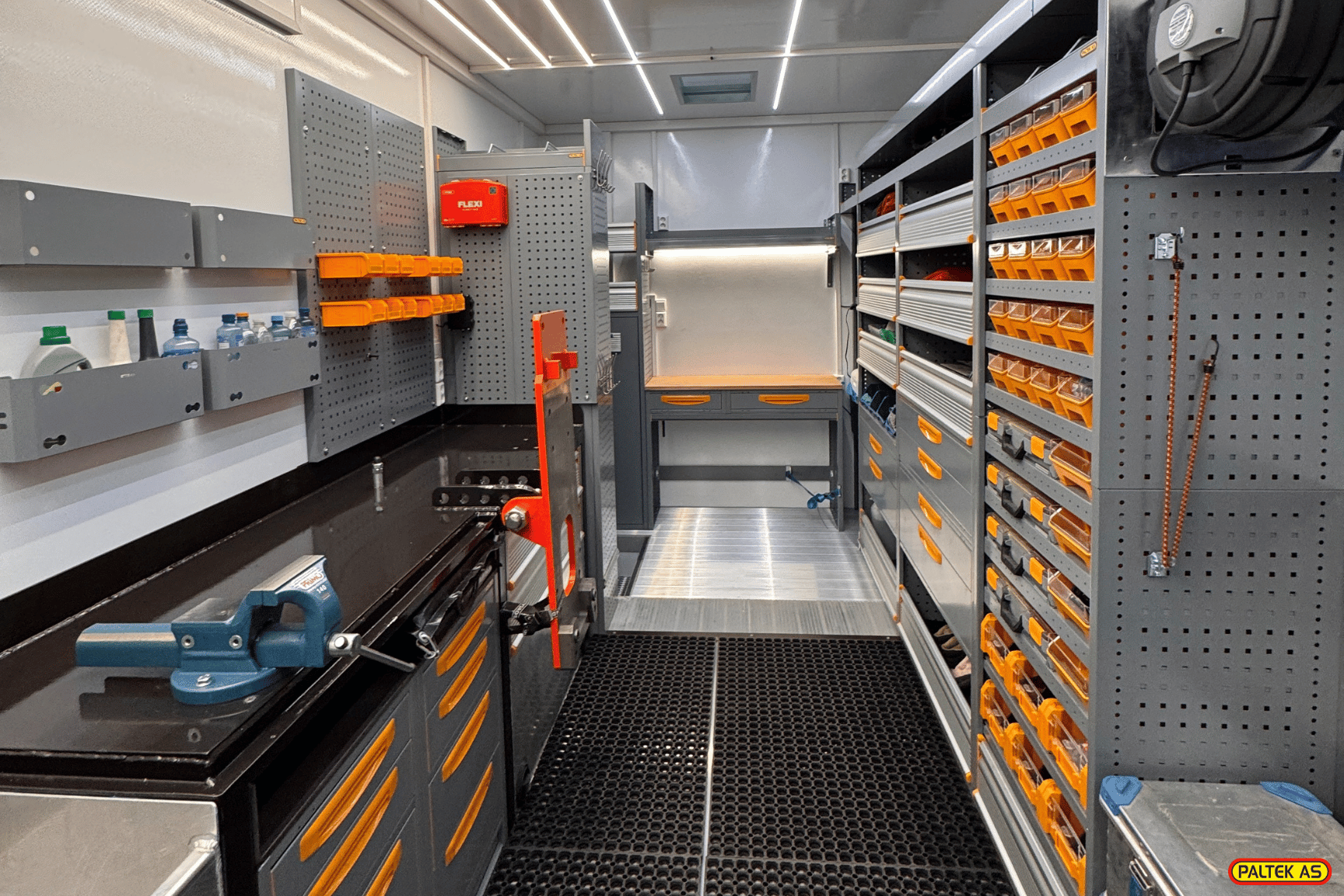 Som på den forrige bilen vi leverte til Hans Borch (Riggservice Nord), er også denne utstyrt med spesialtilpasset hydraulikkbenk med direkte avrenning av hydraulikkolje ned i spilloljetanken.